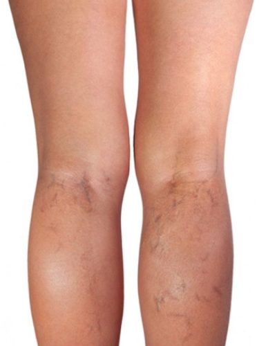 Legs of a middle aged woman with varicose veins and capillaries medical treatment.